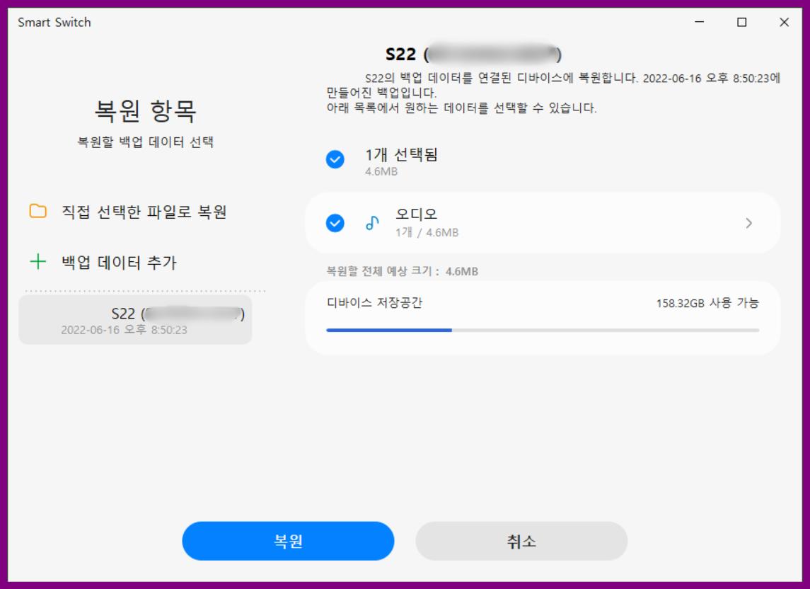 2. 반대로 PC에서 핸드폰으로 보내려면 복원을 해서 진행해주시면 됩니다. 백업이나 복원을 하는 데이터의 양에 따라서 소요시간이 오래 걸릴수가 있습니다.
